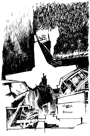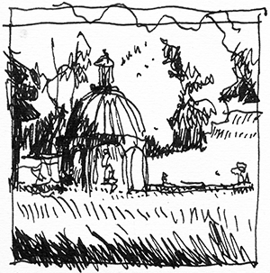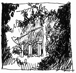 I sketch, render, and doodle with anything that holds ink: crowquills, fountain pens, brushes, felt-tips, technical pens, rapidographs, ballpoints, or whittled bamboo. I sometimes digitally modify images to add halftones or shading, or to enhance contrast. But all images in this gallery began as drawn by hand.